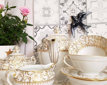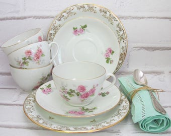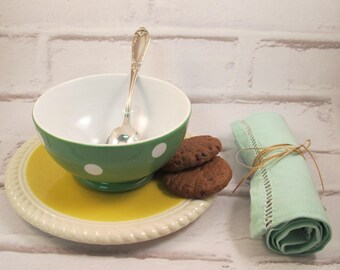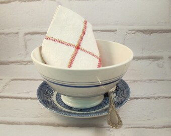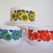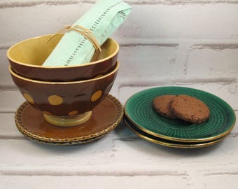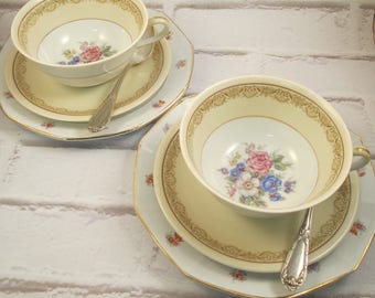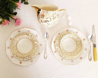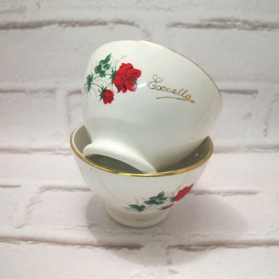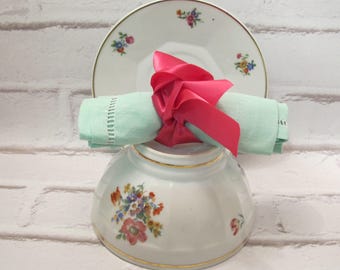 Pretty earthenware coffee bowl Excella 1910s 1920s, floral mug, bols blanc et doré décor floral petit piédouche.